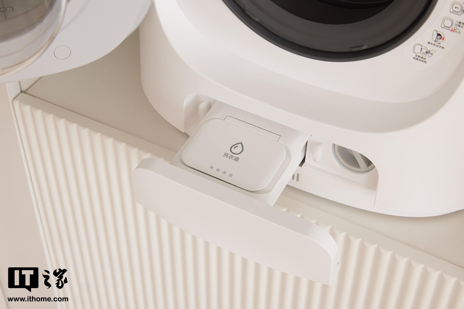 洗衣液投放区域位于机身底部,且支持自动投放,官方表示加一次加满能用五十天(按一天一次的频率来算)。