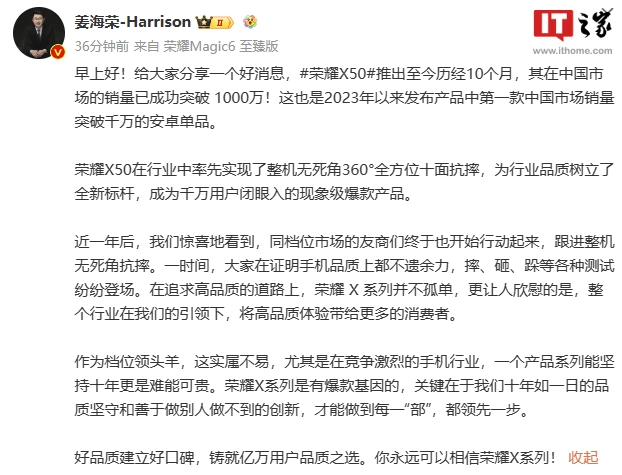 文章来源于互联网:IT之家-荣耀 X50 手机中国市场销量突破 1000 万,用时 10 个月