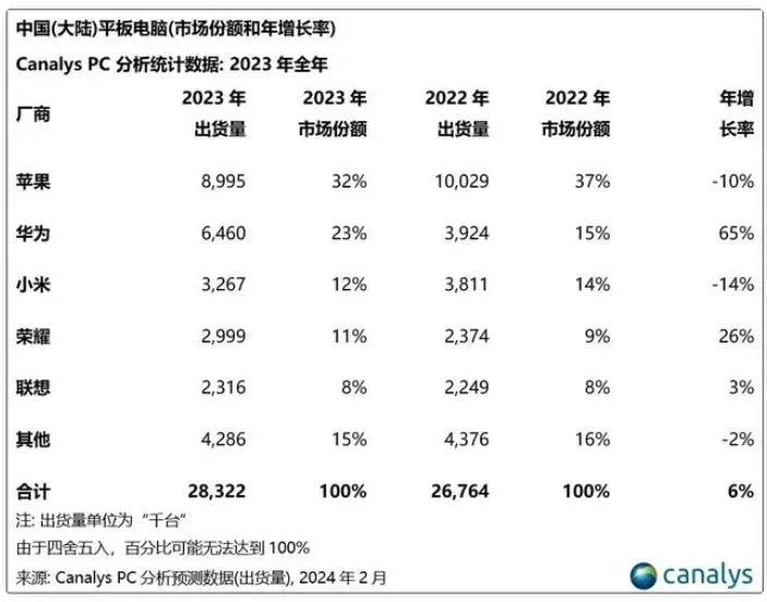 2023年,苹果iPad的出货量为899.5万台,同比下降 10%,市场占有率为 32%,排名第一。华为是646万台,同比增长 65%,也是TOP5 中增幅最大,市场占有率为23%,排名第二。