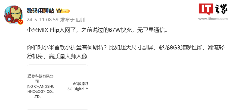 IT之家 5 月 11 日消息,一款型号为 2405CPX3DC 的小米 5G 数字移动电话机 5 月 10 日通过 3C 认证,预计为小米首款竖向折叠手机 MIX Flip。