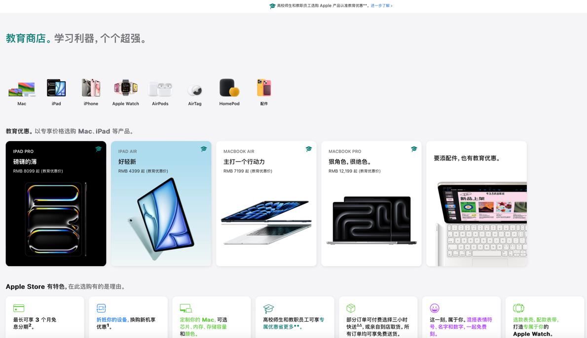 在新版教育商店中,用户可以直接看到Mac、iPad等产品在教育优惠后的起售价,为消费者提供了更加直观的购物体验。虽然目前无法直接查看所有版本产品的具体价格,但苹果公司在页面中通过配图等方式,尽可能地为消费者提供了参考信息。