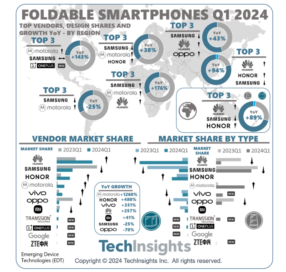 凤凰网科技讯(作者/周文浩)5月22日,根据市场研究机构TechInsights发布的最新数据,2024年第一季度,华为在全球折叠屏智能手机市场供应份额方面取得稳步增长,同比增长257%,一举超越三星成为新的市场份额第一的供应商。