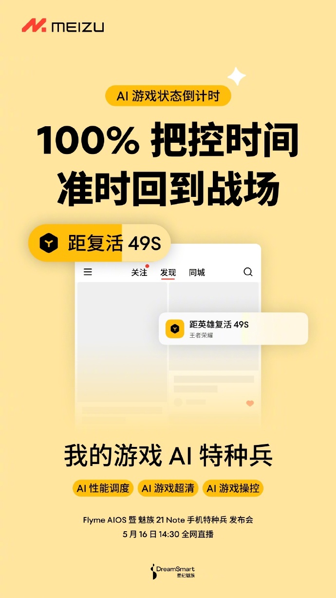 游戏方面,魅族 21 Note 手机将首发 Flyme AIOS 系统,新增 AI 游戏状态倒计时、AI 性能调度、AI 游戏超清和 AI 游戏操控等功能。