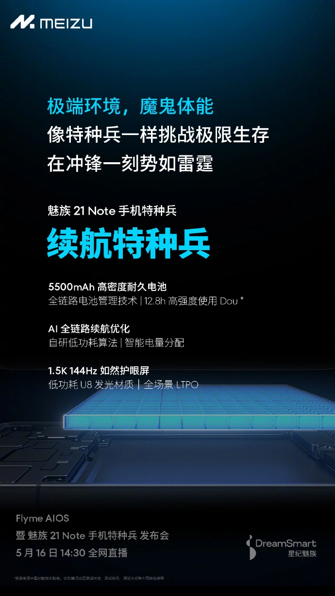 魅族 21Note 手机配备 5500mAh 电池,官方称,支持 12.8 小时高强度使用;手机屏幕采用 1.5K 144Hz 高刷屏,屏幕使用 U8 发光材质,支持全场景 LTPO。