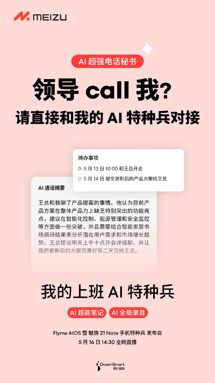 从魅族官方放出的功能预告图来看,AI 通话功能支持通话内容摘要及待办事项整理。