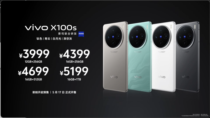 vivo X100s 售价 3999 元起,vivo X100s Pro 售价 4999 元起,5 月 17 日正式开售,即日起至 5 月 26 日购买 X100s、X100s Pro,限量赠送欧洲杯定制周边。