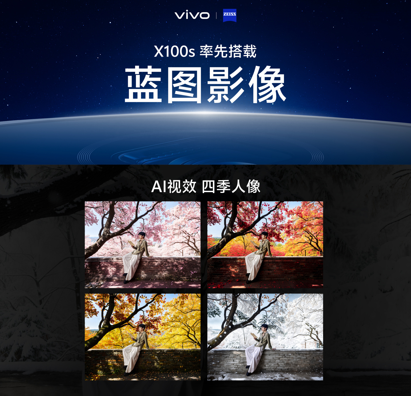 影像方面,vivo X100s 搭载大底潜望的蔡司超级长焦,采用 X100 Ultra 同款「长焦舞台算法」、同款人文街拍相机,同样是演唱会神器和扫街神器。首发搭载蓝图影像,支持四季人像,能让你在同一个地方一次性领略四季的变化。