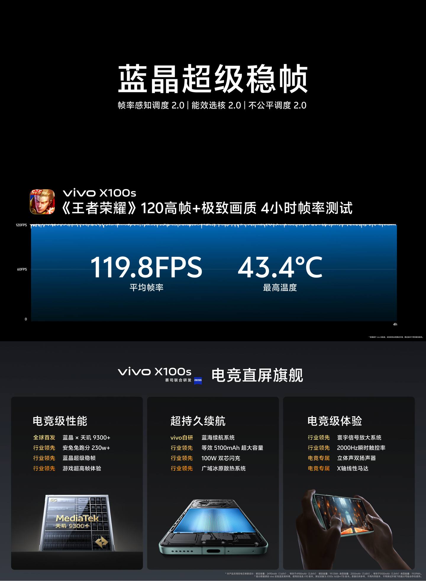 vivo X100s 全球首发联发科天玑 9300+,CPU 主频最高 3.4GHz,安兔兔跑分 230 万 +。《王者荣耀》120 高帧 + 极致画质 4 小时帧率测试,平均帧率 119.8FPS,最高温度 43.4°C。