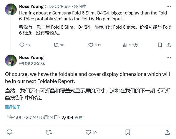 罗斯・杨表示 Galaxy Z Fold6 Slim 的屏幕要比 Galaxy Z Fold6 更大,售价应该和 Fold6 持平,但不支持 S Pen 手写笔输入。