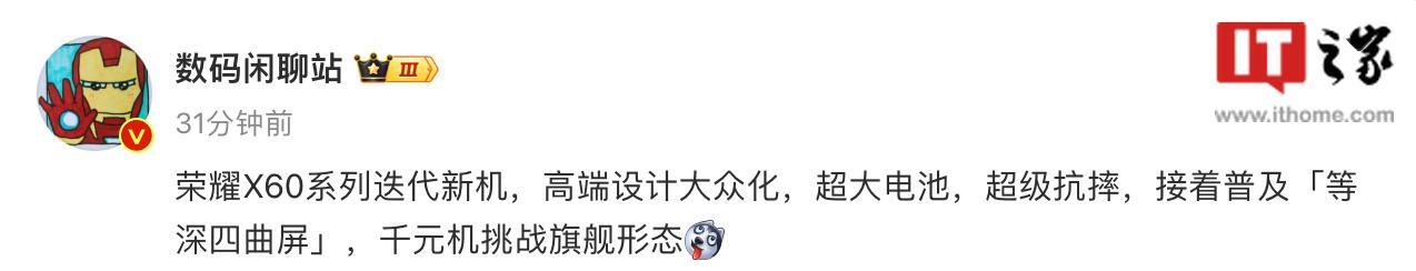 爆料称,荣耀 X60 系列迭代新机,“高端设计大众化”,采用等深四曲屏,“千元机挑战旗舰形态”,搭载“超大电池”,同时“超级抗摔”。
