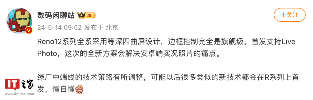 IT之家 5 月 14 日消息,博主 @数码闲聊站 今日发文爆料称,OPPO Reno12 全系将采用等深四曲屏设计,边框控制做到“旗舰级”,并首发支持 Live Photo,号称“解决安卓端实况照片的痛点”。
