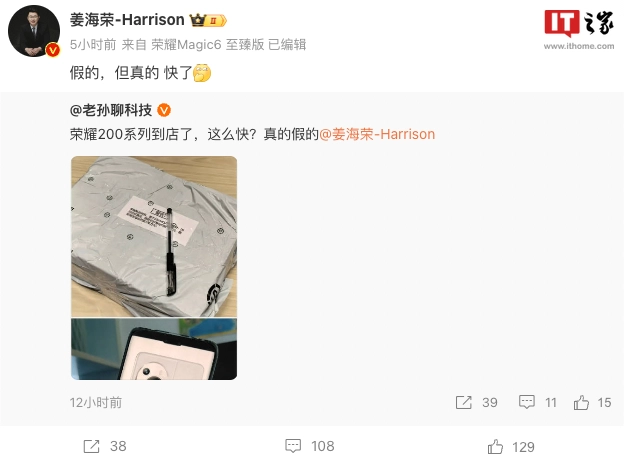 今日早些时候,荣耀终端有限公司中国区 CMO(首席营销官)姜海荣对网上的一组“荣耀 200 系列手机”到店的照片进行了回应:“假的,但真的 快了。”