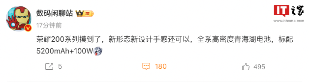 IT之家 5 月 14 日消息,博主 @数码闲聊站 今日发帖称 荣耀 200 系列手机全系采用青海湖电池,标配 5200mAh 电池,支持 100W 快充。