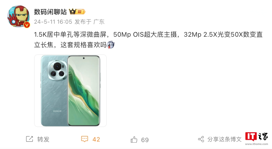 荣耀 200 系列手机还有望搭载 1.5K 居中单孔等深微曲屏,配备 5000 万像素 OIS 超大底主摄,3200 万像素 2.5X 光变 / 50X 数变直立长焦。