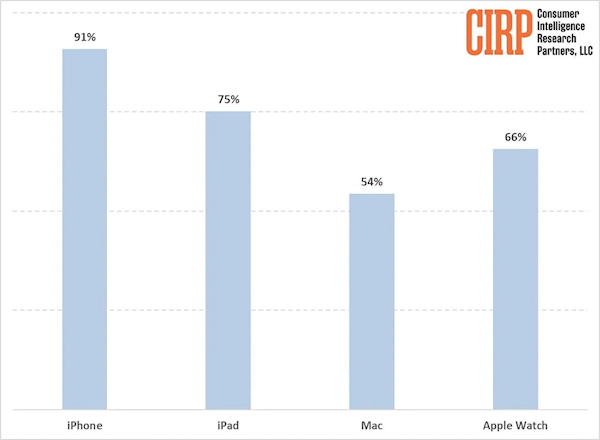 根据市场调查机构CIRP发布的报告,调查显示上一季度购买过苹果产品的用户群体中,有91%拥有iPhone、75%拥有 iPad、66%拥有Apple Watch、54%拥有Mac电脑。