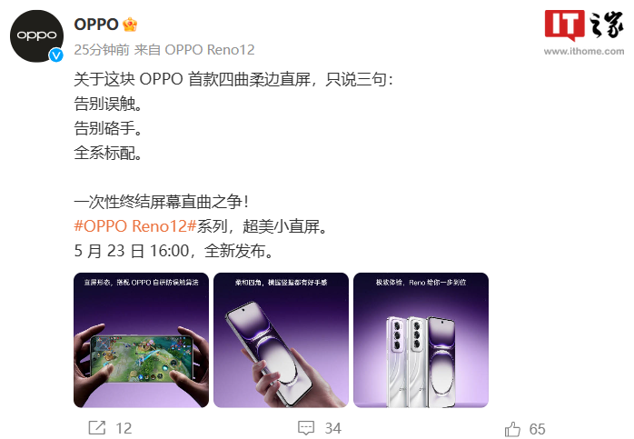 IT之家 5 月 16 日消息,OPPO 今日发布了旗下 Reno 12 系列手机正面形象渲染图,并官宣该系列手机全系标配“四曲柔边直屏”。