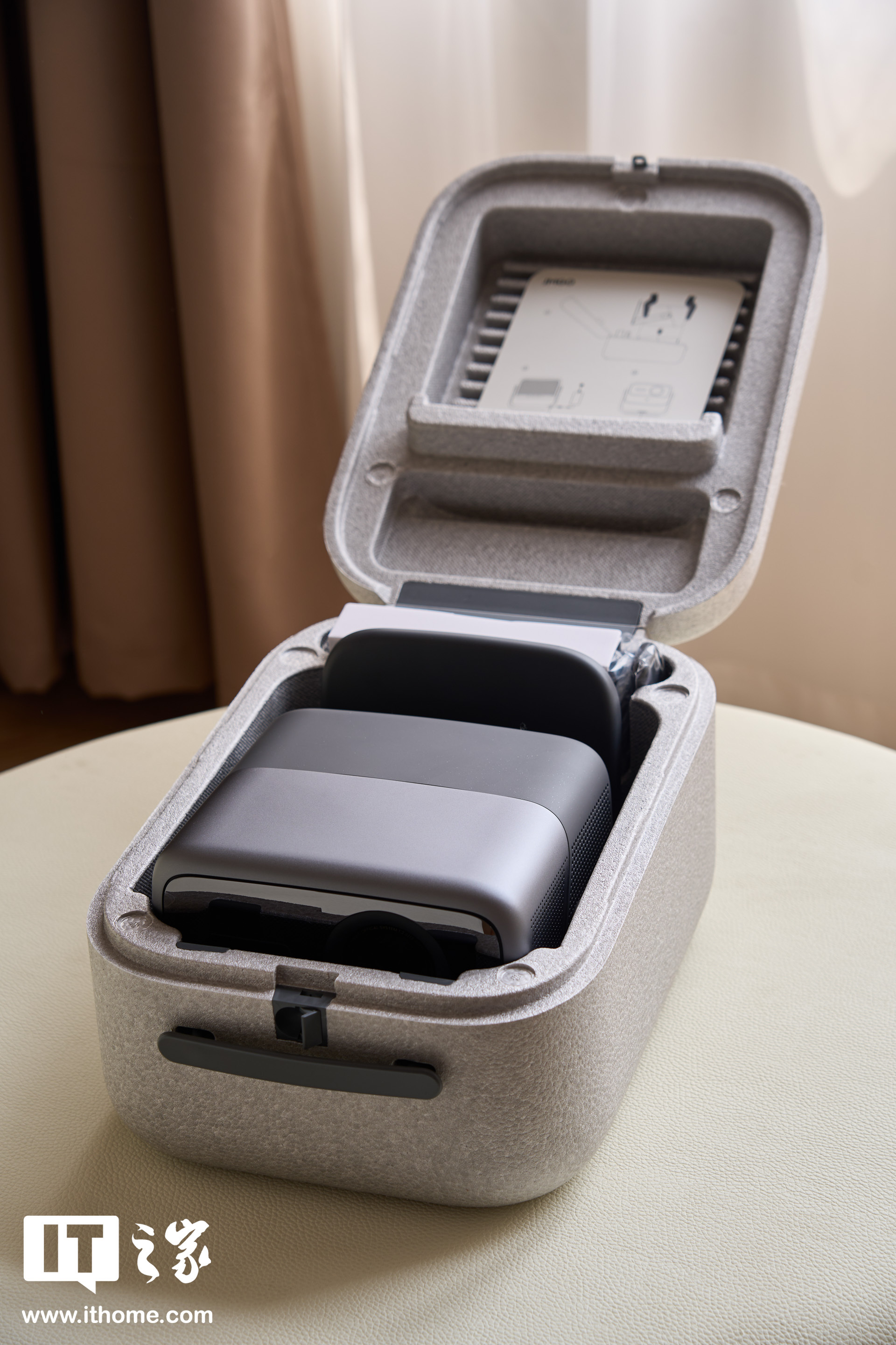 值得一提的是,坚果 N1S Ultra 4K 至臻版的外包装设计也非常有“小心思”,外包装采用了手提式设计,搭配 EPP 泡沫材质,不仅可以作为投影仪的保护,还可以多次利用。户外使用,合上盖提着就能走。