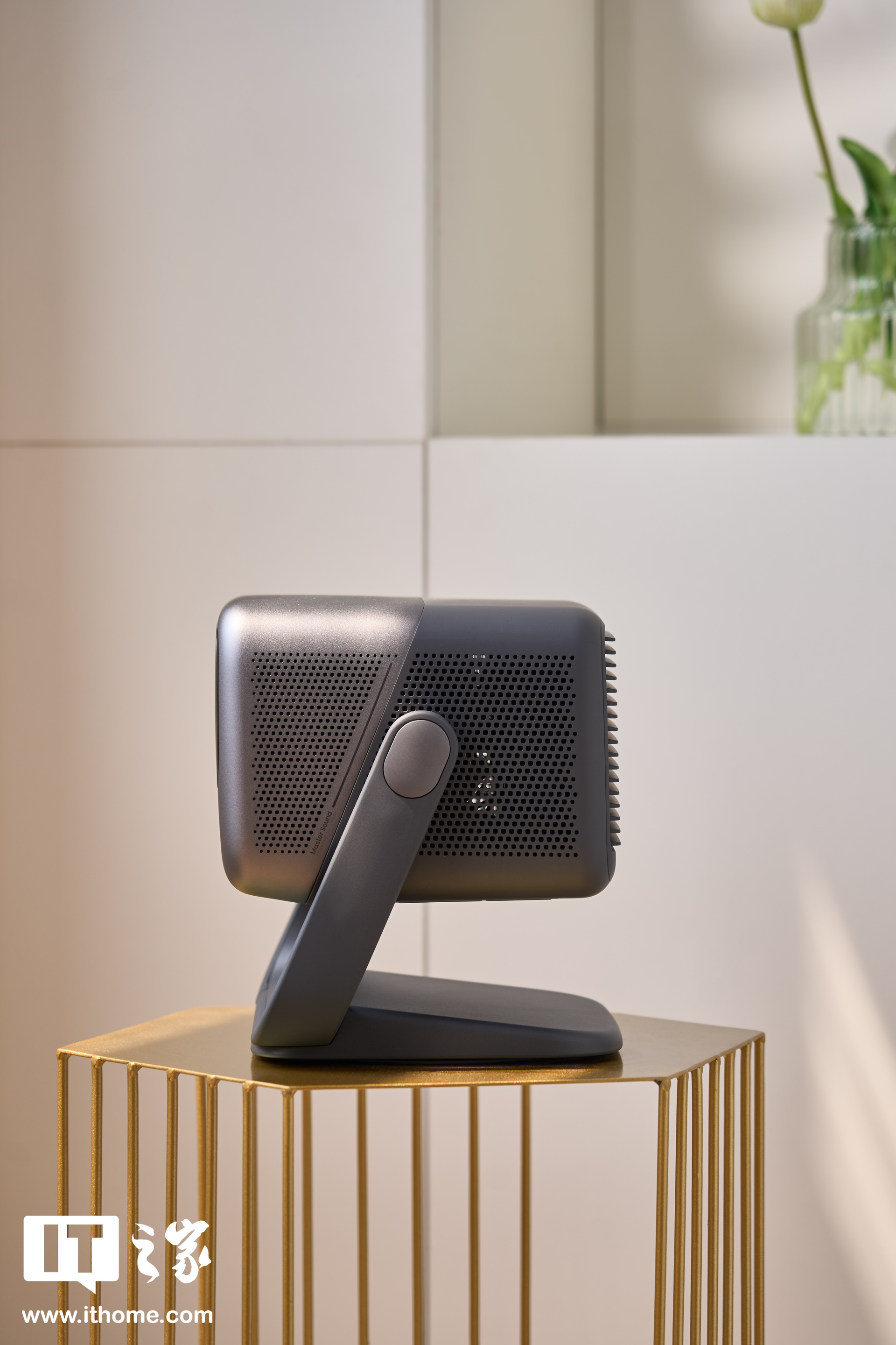 坚果 N1S Ultra 4K 至臻版延续了家族备受好评的“一体式算法云台”设计,投影仪主机下方有一个支架底座,实现了 360° 水平调节和 135° 垂直方向无级悬停。
