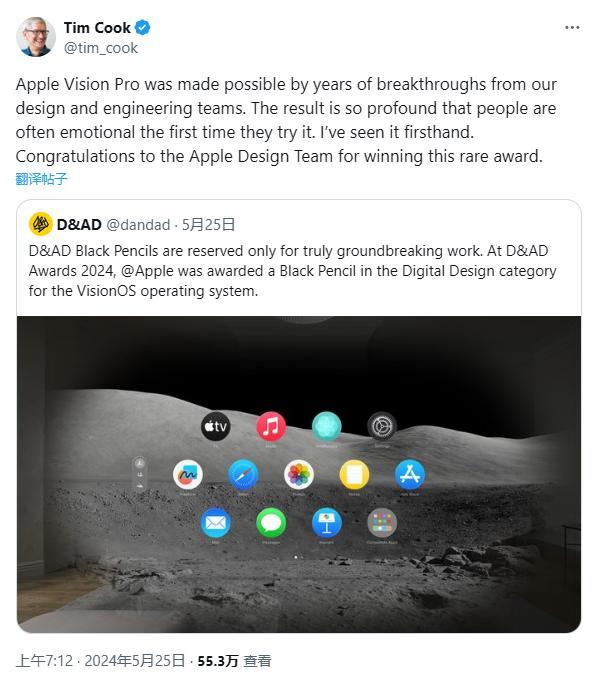 当地时间 5 月 25 日,苹果 CEO 蒂姆・库克(Tim Cook)在社交媒体 X 上发帖称,首次使用 Vision Pro 的用户往往会感到“情感上的触动”:“Vision Pro 得益于我们设计和工程团队多年来的突破性成果。其带来的影响如此深刻,以至于人们初次尝试时往往会感到情感上的触动。我亲眼目睹过这种情况。恭喜苹果设计团队荣获这项殊荣。”