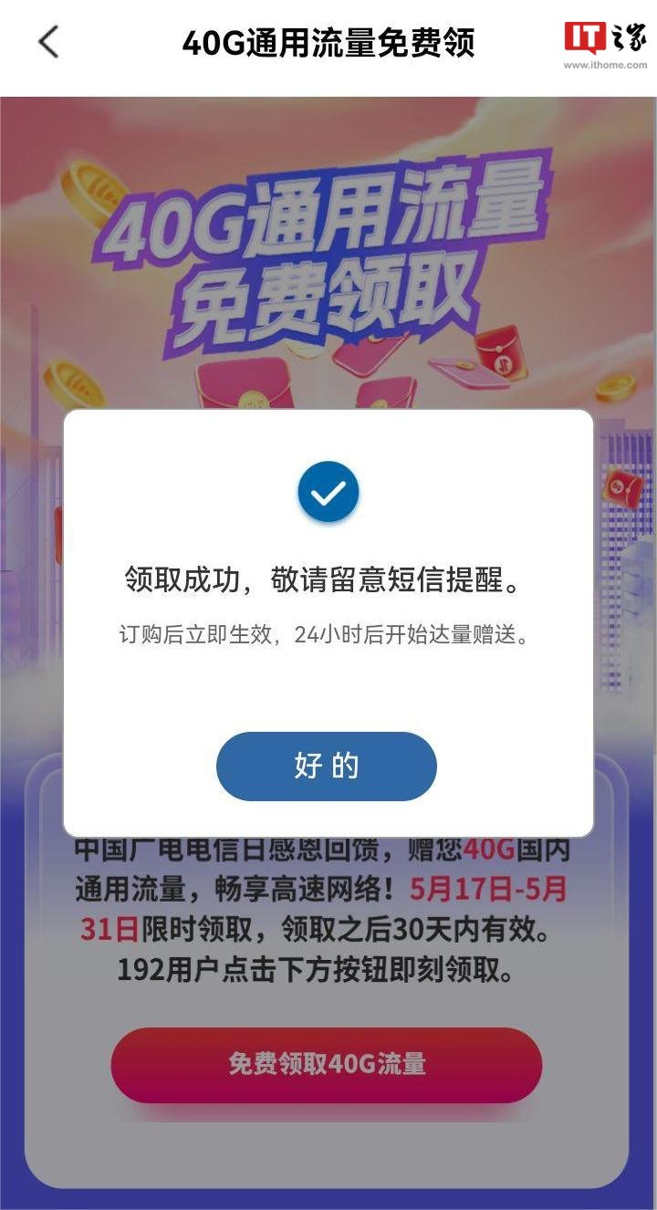 IT之家 5 月 17 日消息,据IT之家小伙伴投稿,中国广电 App 今日(5 月 17 日)开启了“40G 通用流量免费领”活动。