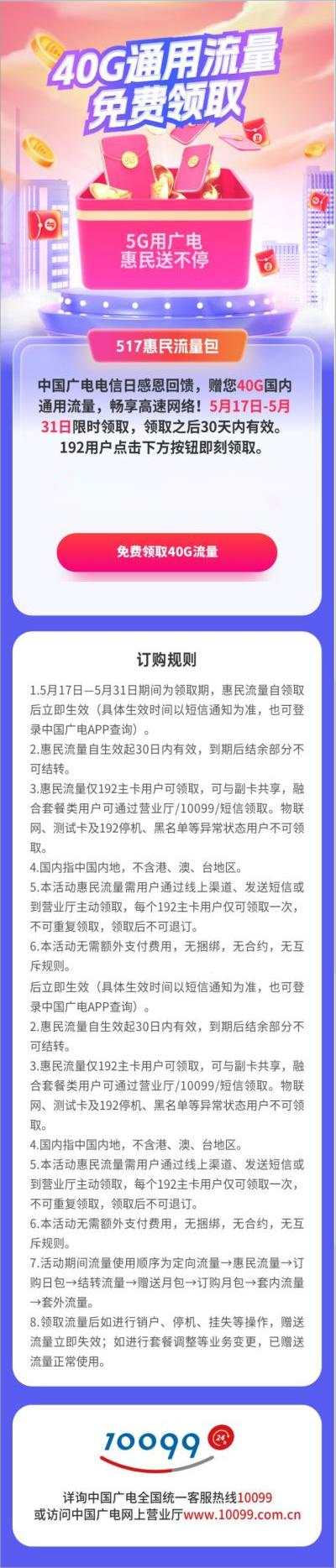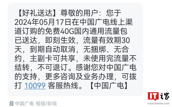 文章来源于互联网:IT之家-5.17 电信日,中国广电送 40G 全国通用流量