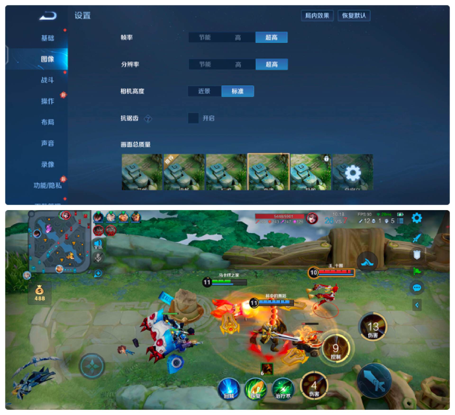 接下来《王者荣耀》简单实测,依旧是最高画质 + 90 帧,在线 5V5 一局,游戏 10 分钟左右。