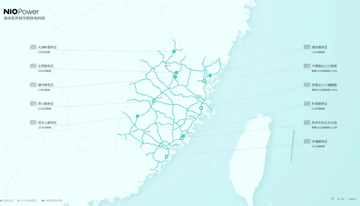 蔚来NIO宣布海峡西岸城市群高速换电网络正式打通,共布局 17 座高速换电站,连接福建省 9 座地级市,涵盖 G3 京台、G15 沈海、G25 长深高速公路。