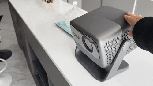 和传统固定安装的投影仪对比,坚果 N1S Ultra 4K 至臻版更加灵活,产品本身的摆放位置无需变动,也无需通过书本给投影仪垫高,只需要摆动云台,就可以将画面投到不同的墙面。