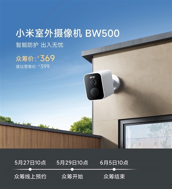 快科技5月27日消息,今日,小米室外摄像机BW500在小米商城上架,将于5月29日开启众筹,众筹价369元。