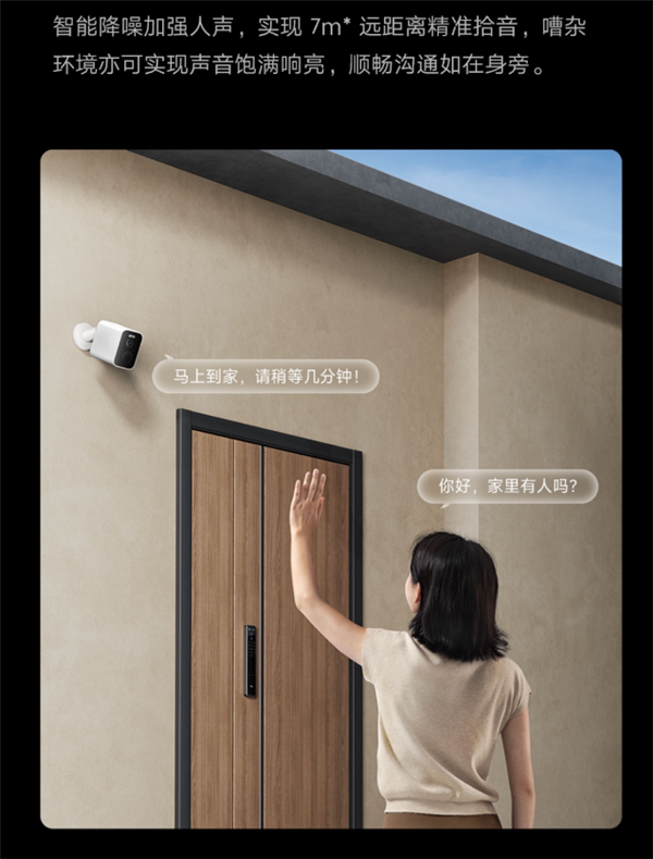 另外,摄像机支持智能降噪加强人声,实现7米远距离对讲,内置米家安全芯片,防止数据破解。