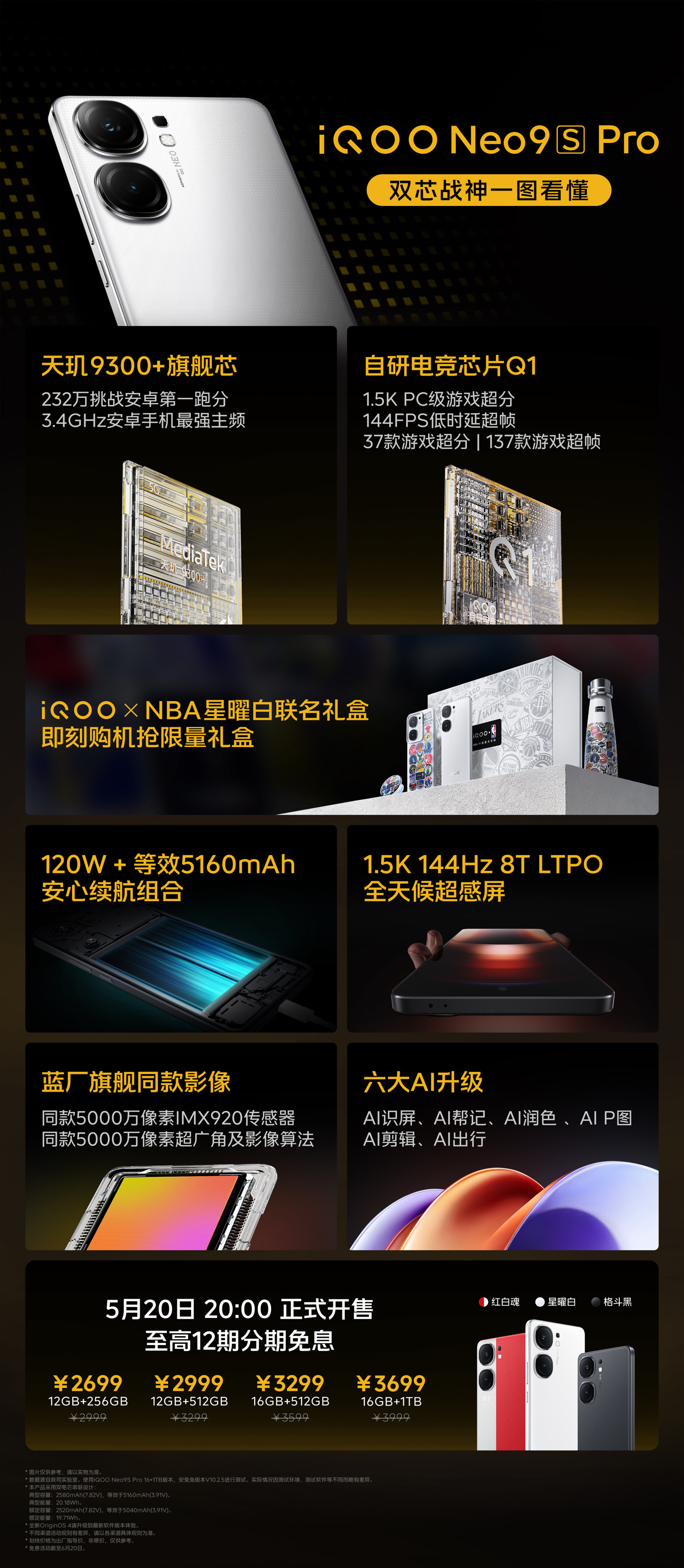 IT之家 5 月 20 日消息,今晚 iQOO 发布了 iQOO Neo9S Pro 新机,搭载天玑 9300 + 处理器、自研电竞芯片 Q1,618 限时优惠价 2699 元起。
