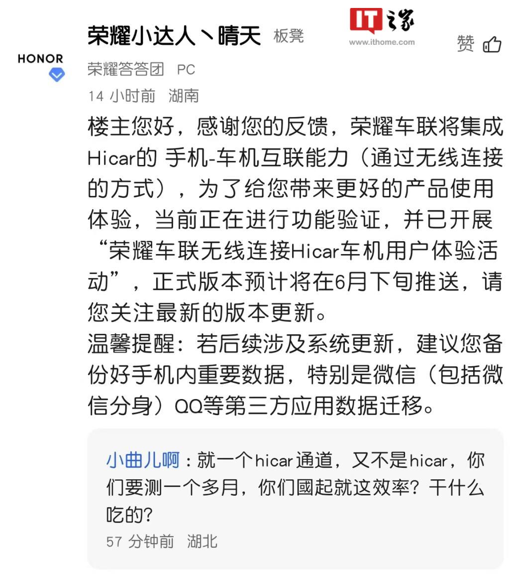 文章来源于互联网:IT之家-荣耀 Magic6 系列手机内测华为 HiCar 通道连接荣耀车联 Carlife