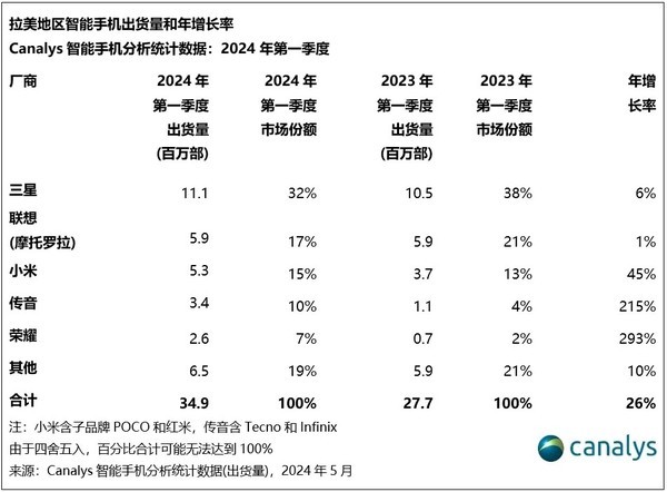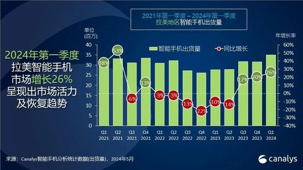 5月28日,Canalys最新报告显示,2024年第一季度,拉美智能手机市场持续蓬勃发展,出货量达3490万部,同比增长26%。这标志着该市场连续第三个季度实现两位数增长。