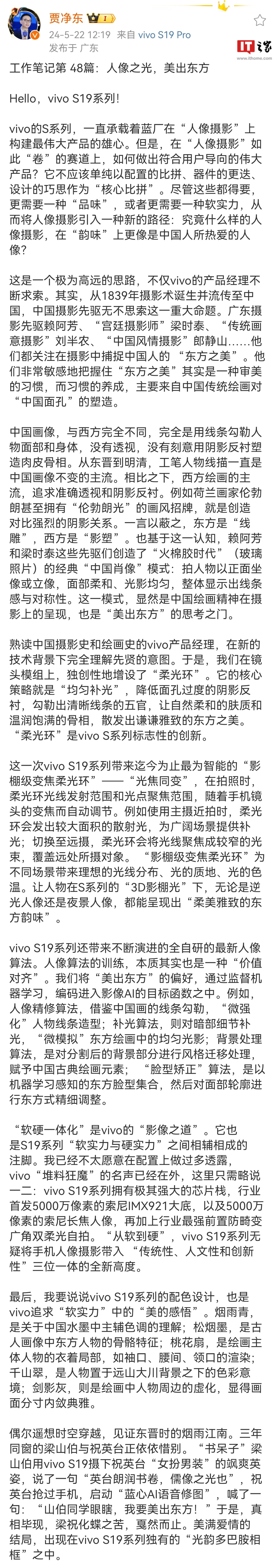 IT之家 5 月 22 日消息,vivo 品牌副总裁,兼品牌与产品战略总经理贾净东今日发文,公布了 vivo S19 系列手机核心卖点。