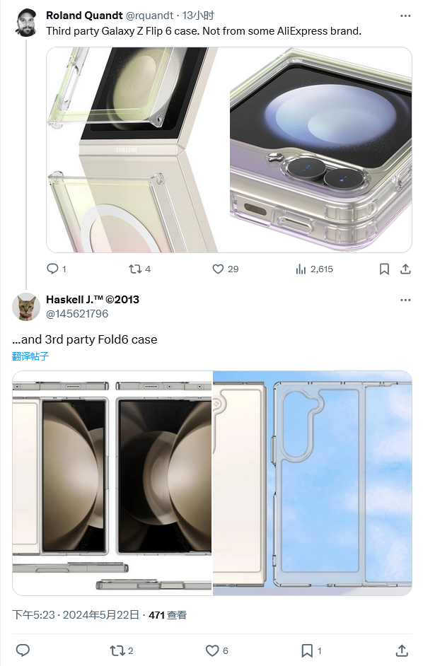 IT之家 5 月 23 日消息,消息源 Roland Quandt 今天发布推文,分享了三星 Galaxy Z Flip6 的保护套渲染图,随后有网友回复,还分享了三星 Galaxy Z Fold6 手机的保护套。