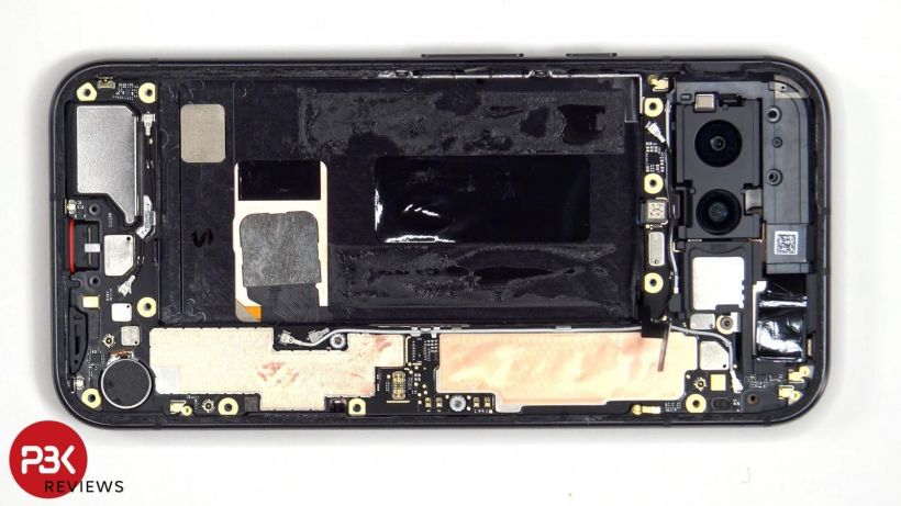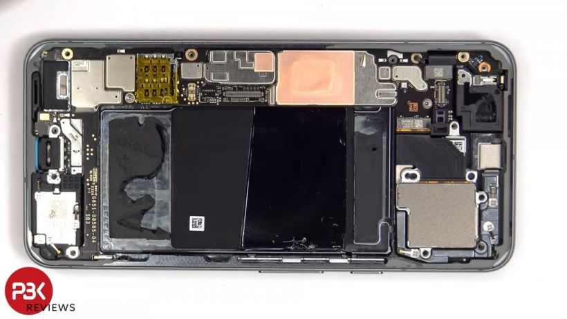 拆解过程中还发现 Pixel 8a 手机内部没有热导板(Vapor Chamber),有大量的石墨和铜膜以及散热垫,但没有用于 Tensor G3 芯片组的 VC 均热板。