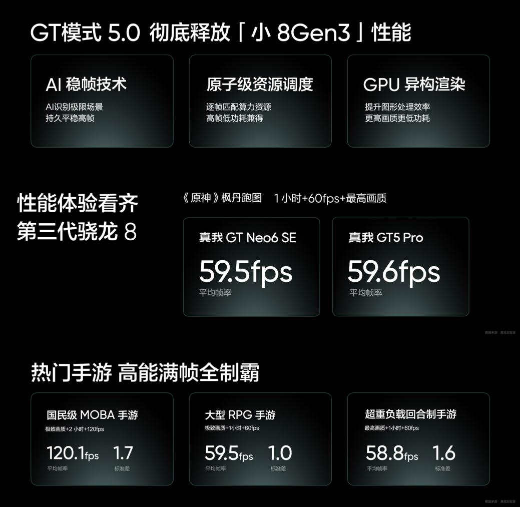 真我 GT Neo6 SE 搭载第三代骁龙 7 + 处理器,与骁龙 8Gen3 同工艺同款架构。采用 10014mm² 超万级散热 VC + 中框冰封结构。