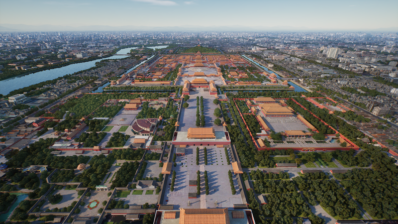 为让用户见到日常所见不到的北京中轴线之景,“数字中轴·小宇宙”通过高清照扫、游戏引擎、云游戏、PCG程序化内容生成、SmartGI等游戏技术,采用4级地图模式,首次制作200km×200km超大地图,不仅对北京中轴线7.8公里核心遗产区进行了精细还原再现,同时还运用游戏互动设计思路以及解谜收集等交互玩法,对“三条中轴线”——即物理的中轴线、历史的中轴线和思想的中轴线——在数字化展陈维度实现了生动的表达,旨在探索用游戏科技助力文化遗产价值阐述、展陈、活化及传承的新模式。