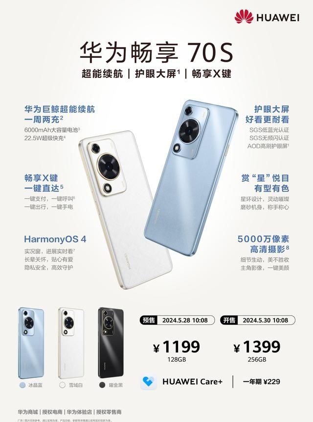 IT 之家 5 月 28 日消息,华为官方今日宣布畅享 70S 手机开启预售,主打“华为巨鲸超能续航”,号称可实现一周两充,还拥有 6.75 英寸高刷护眼屏、畅享 X 键等功能。