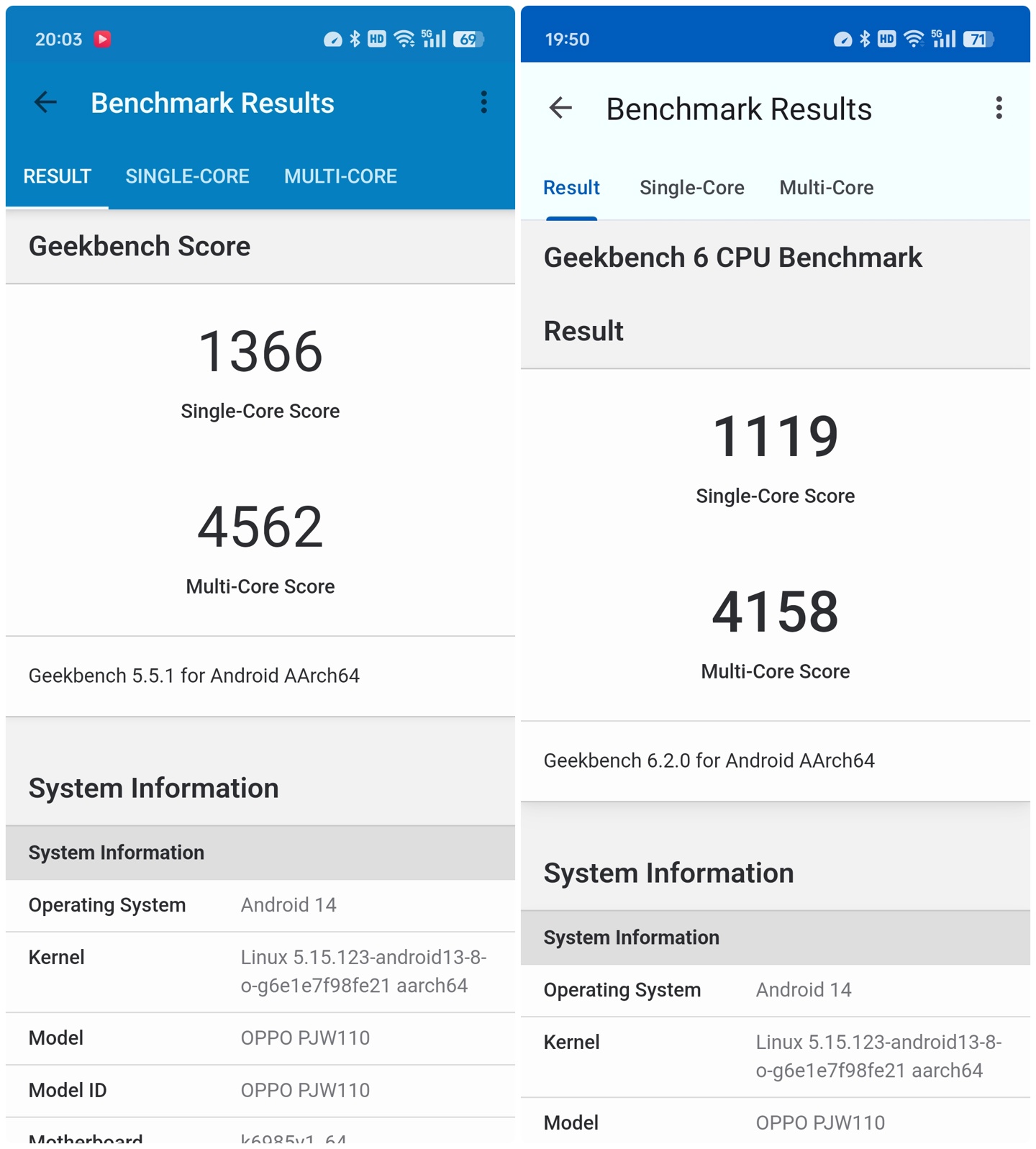在 GeekBench5/6 跑分中,OPPO Reno12 Pro 单核 1266/1119 分,多核为 4562/4158 分。