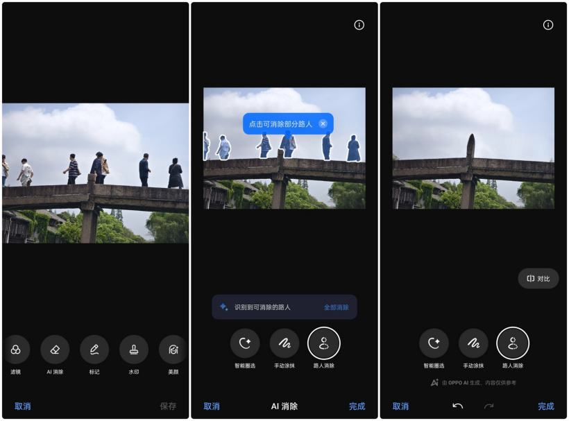 不仅如此,OPPO Reno12 Pro 的 AI 消除功能也迎来了全新的体验升级。除了传统的圈选和涂抹消除方式外,新增的路人一键消除功能使得 AI 消除变得更加便捷和直观。