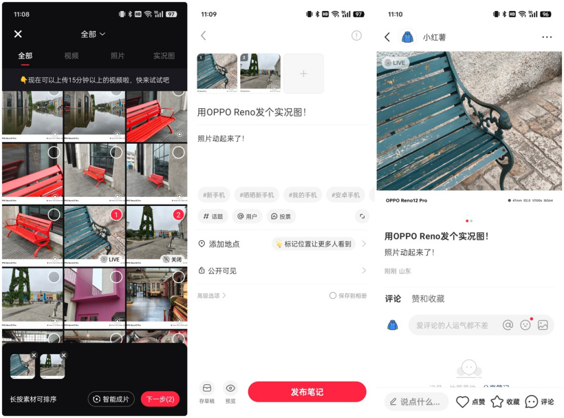 OPPO Reno12 系列在影像体验上最大的亮点,便是安卓首个能发布实况照片,全焦段三摄均支持实况照片,目前阶段支持上传小红书分享