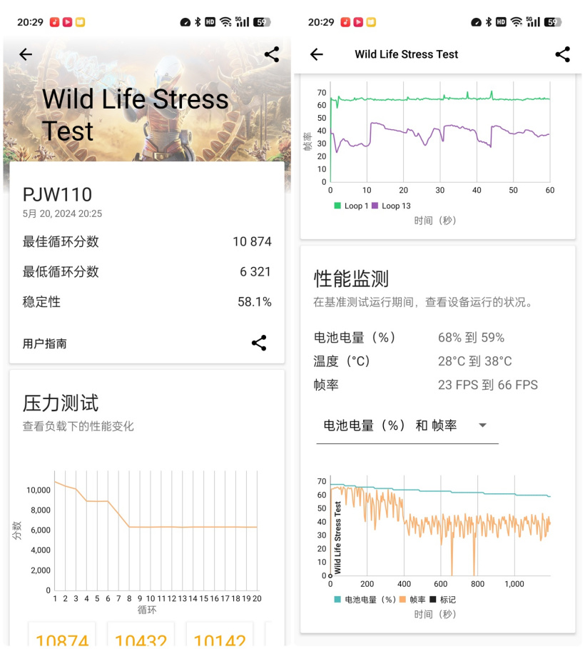 3D Mark 测试中,连续 20 轮高强度 Wild Life,稳定性在 58.1%,最低循环分数为 6321,从测试来看,OPPO Reno12 Pro 的性能释放偏保守,不是那么激进,更注重温控和功耗控制。