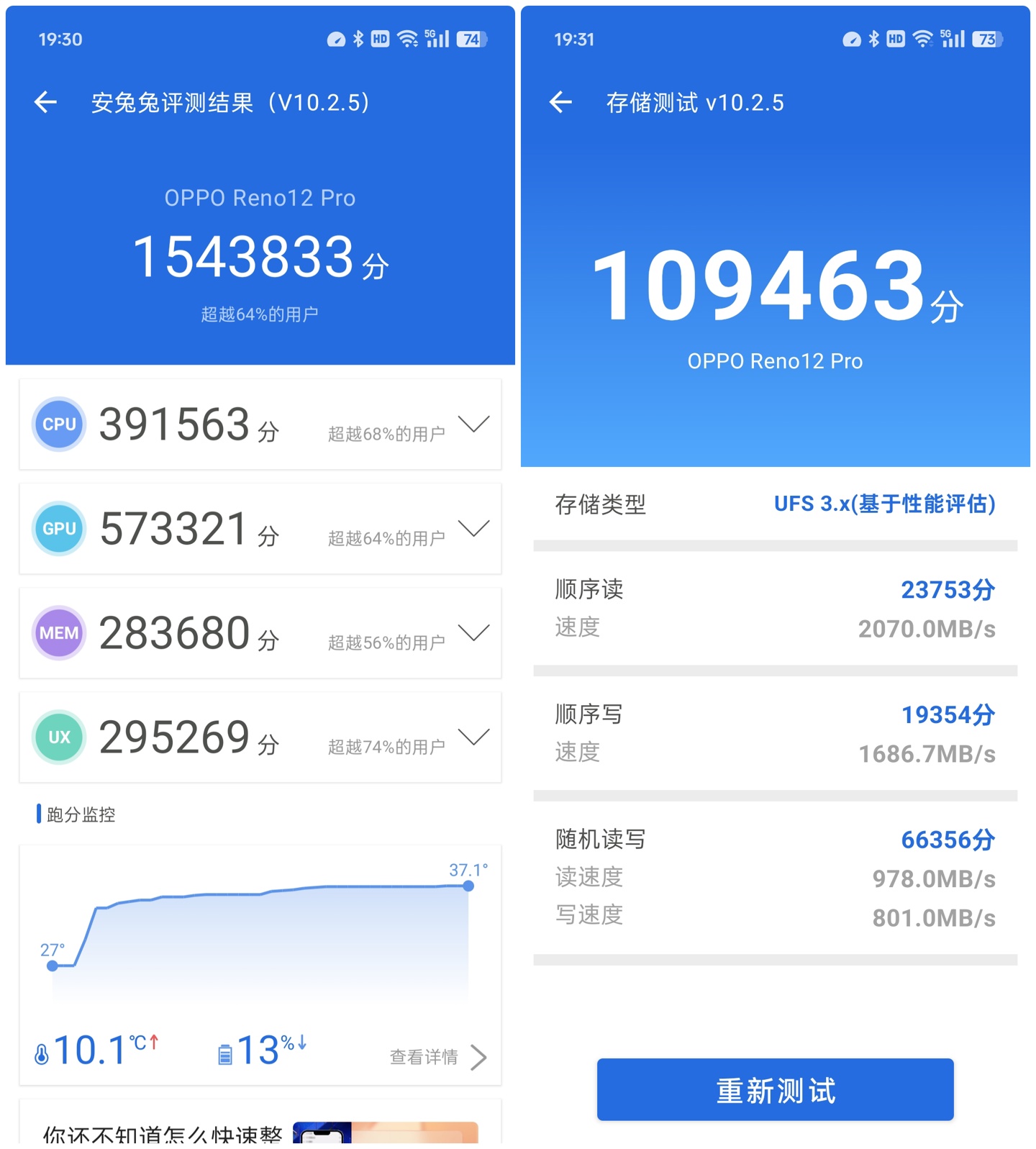 闪存性能方面,OPPO Reno12 Pro 在安兔兔的存储测试中,分数达到了 10 万 +,其中写入速度均达到了 2070MB/s以上,UDS3.1 的标准表现。