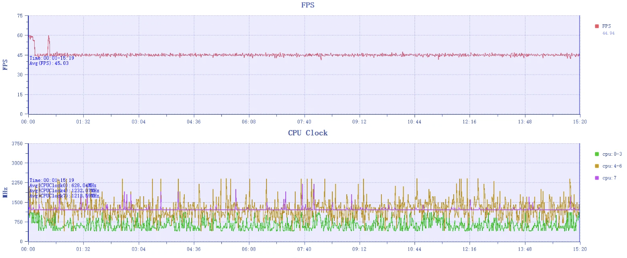接下来最高画质的《原神》测试,游戏测试场景为野外跑图 + 打怪。面对更吃性能的《原神》,OPPO Reno12 Pro 的性能表现就略保守了些,游戏开始便保持在 45fps 上下,虽说降帧,但后期基本全程稳帧 45fps,即便是战斗场景,肉眼可见的掉帧情况也并不多,游戏体验还是很稳定的。