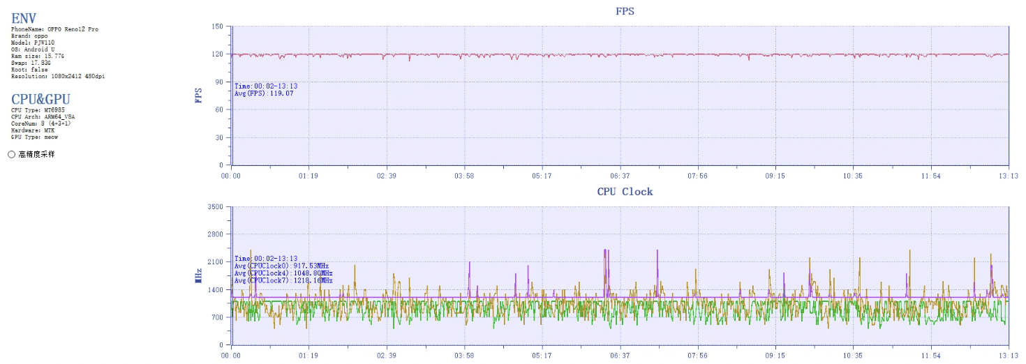 OPPO Reno12 Pro《王者荣耀》120 帧极致画质,平均帧率 119.07fps