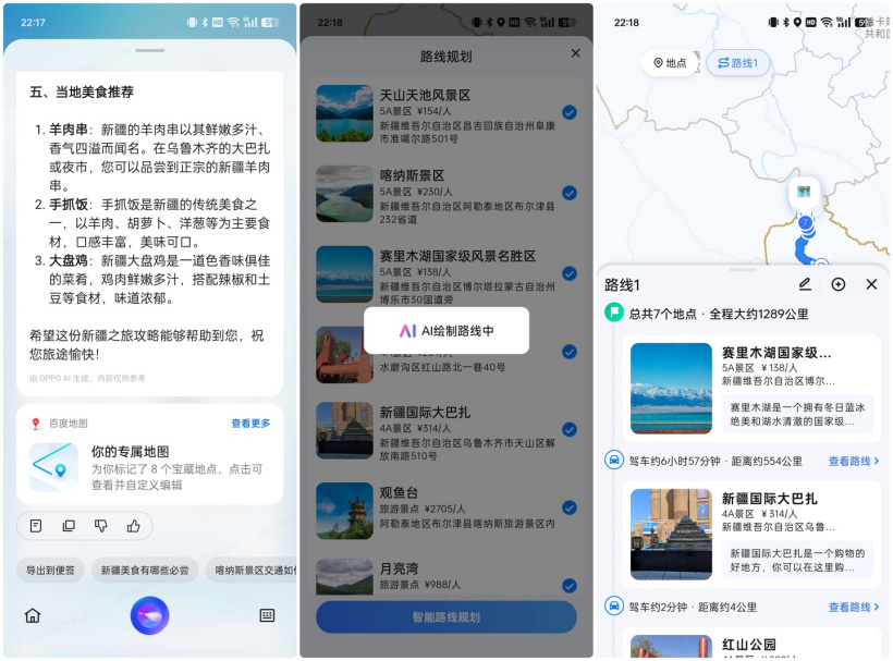 比如,当你在小红书上看到某城市的旅游攻略时,只需长按电源键,呼出小布,并“定制我的旅行路线”,随后小布会通过“识屏”功能,将该旅游攻略标记在百度地图中,点击即可查看路线规划。