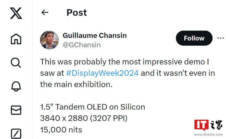 根据显示行业研究机构 DSCC 分析师 Guillaume Chansin 在 X 平台分享的信息,该微型显示器大小为 1.5 英寸,分辨率达到 3840*2880,拥有 3207 PPI 像素密度。