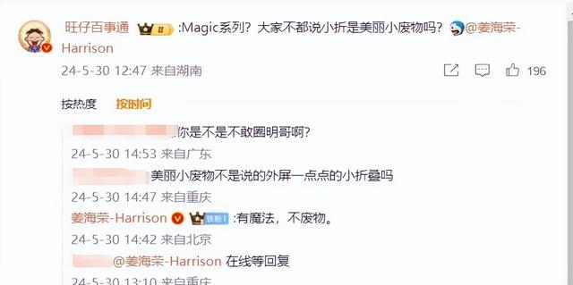 “Magic系列?大家不都说小折是美丽小废物吗?”另一外博主评论称,并手动@了荣耀终端有限公司中国区CMO姜海荣。