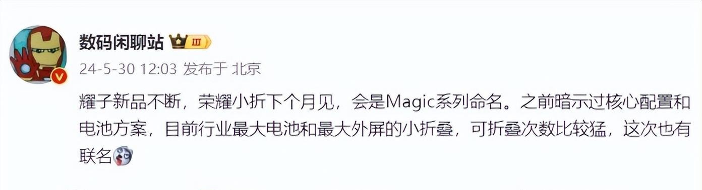 5月30日,知名爆料博主@数码闲聊站 再爆猛料:“荣耀小折下个月见,会是Magic系列命名。”该博主还补充道,目前行业最大电池和最大外屏的小折叠,可折叠次数比较猛,这次也有联名。